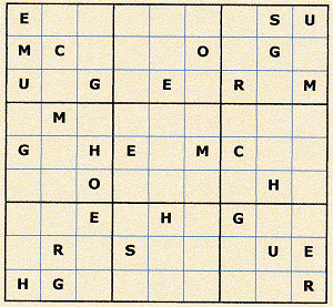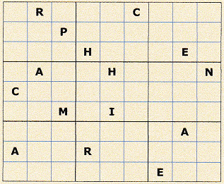 Placez une lettre dans chaque case comme suit : Chaque ligne et chaque colonne doivent contenir toutes les lettres. Dans chacun des carrés les lettres ne doivent figurer qu’une seule fois |