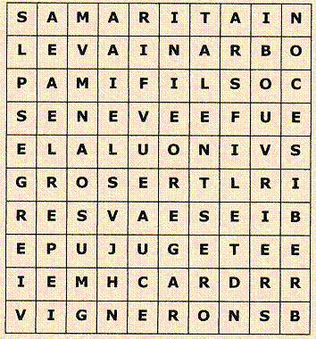 1- Sa fille fut ressuscitée par Jésus. -- Possessif. 2- Adjectif (singulier) qui qualifie les parois du rocher dans le Cantique des Cantiques (ch. 2). 3- La vérité doit être comme une ceinture autour de chacun d’eux.-- Du verbe aller. 4- Infinitif. -- Celui du pécheur est comme un sépulcre ouvert. 5- Mère de Thébach et Maaca (Genèse 22). 6- Philippe, frère d’Hérode, fut tétrarque de cette contrée (Luc 3). Pronom démonstratif. 7- Vous le serez par du pain (inversé). 8- Pronom personnel. -- Tribu d’Israël qui repose comme une lionne. 9- Prophète, fils de Beéri, à qui l’on doit un livre prophétique (inversé). Nom du second fils de Juda et Schua (inversé, Genèse 38). 10- Note de musique. -- C’est par là que David saisissait le lion et le tuait (pluriel). |