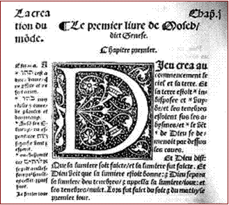 1ère page de la Bible d’Olivetan. on note que la numérotation des versets n’existait pas encore, chaque étoile dans le texte renvoie à une note dans la marge. |